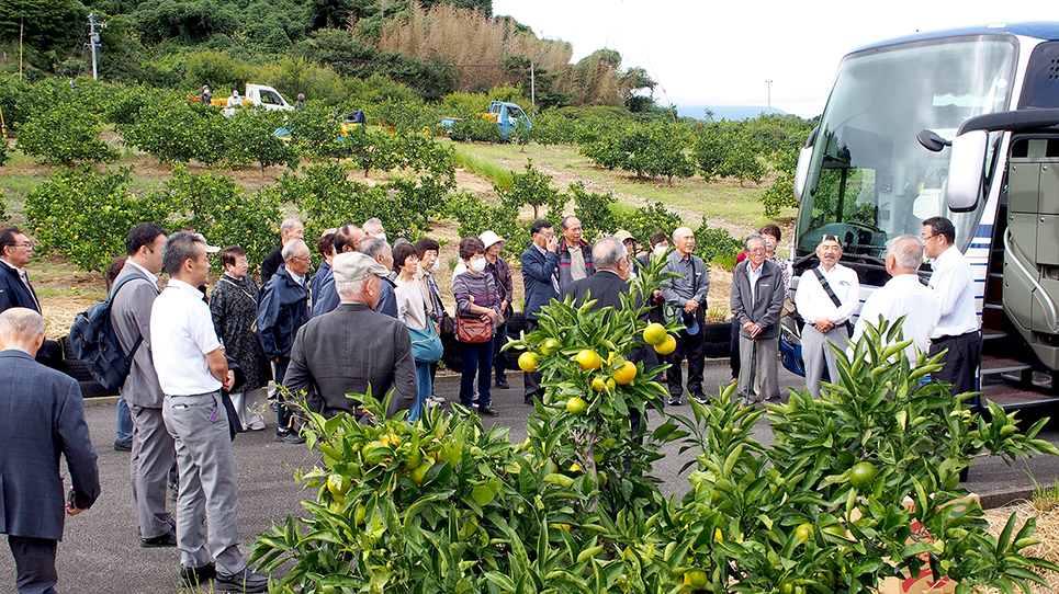10月15日、長野県より「JA大北年金友の会」の皆様が「ふれあい旅行」の途中で当社自社農園にお立ち寄りくださり、「ミカン狩り」を楽しんでいただきました。